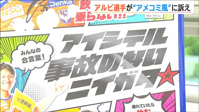 「アイシテル事故のないニイガタ」アルビレックス新潟の選手起用したポスターで交通事故防止を呼びかけ 2024年7月17日(水) 19:20 国内 飲酒運転の根絶を目指して新潟県警などがアルビレックス新潟の選手を起用し作成したポスターが17日、お披露目されました。「飲酒運転ゼッタイダメ!」「疲れていたら休む勇気を」お披露目されたポスター。アルビの…