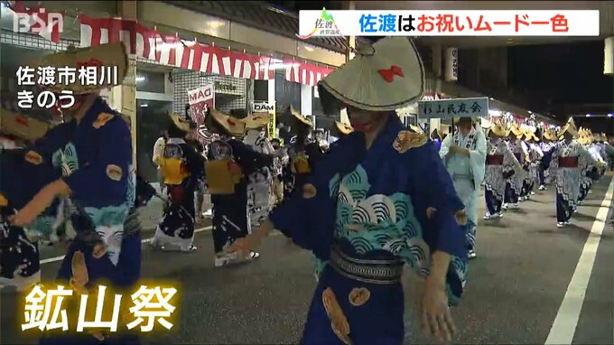 「鉱山祭」は金山労働者をねぎらい、鉱山の繁栄を祈願する佐渡三大祭りの1つです。27日は世界遺産登録を祝う横断幕も登場しました。