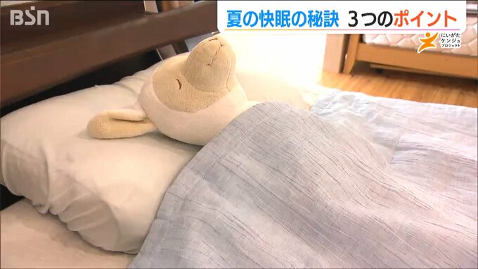 にいがたケンジュプロジェクト 寝苦しい夜が続く夏 快適な睡眠のポイントは3つ 『室内環境』『布団や服装』『寝る前の行動』 2024年8月18日(日) 06:00 国内 暑く寝苦しい夜が続いていて、ぐっすり眠れていないという人はいませんか?厚労省がまとめた季節ごとの平均の睡眠時間を表したものを見ると、夏は暑さなどもあって、ほかの季節よりも平均時間が短いのです。途中で…