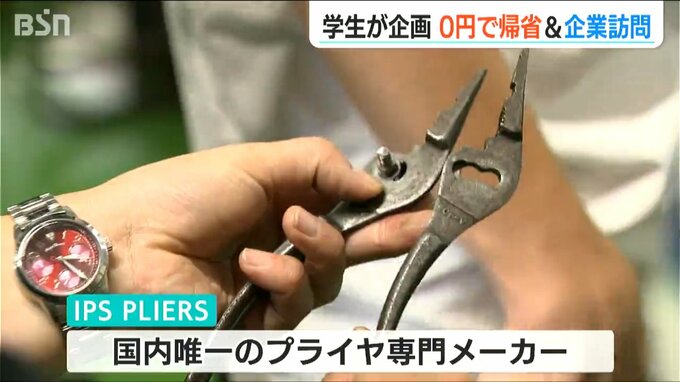 掴んだり挟んだりする際に使う『プライヤ』という工具を手掛ける国内唯一の専門メーカーで、学生たちは社員から説明を受けながら、普段目にすることのない製造工程をじっくりと見学しました。