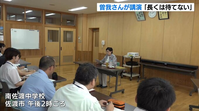 曽我ひとみさんは南佐渡中学校に集まった小中学校の職員に向けて講演を行いました。46年前の1978年に母親のミヨシさんと一緒に自宅近くから北朝鮮に拉致された曽我ひとみさん。今も帰国が果たせていない母・ミヨシさんは92歳になりました。