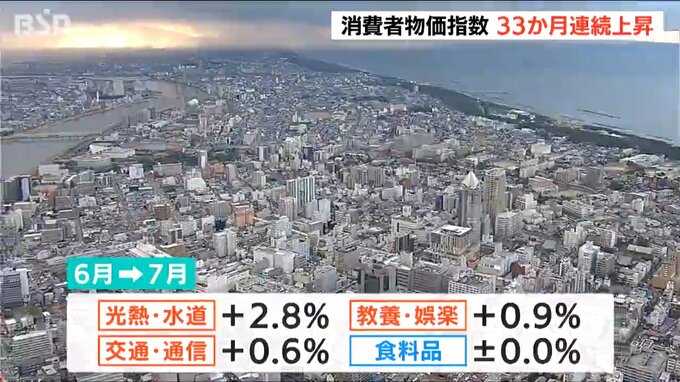 6月との比較では食料品は値上がりに歯止めがかかったものの光熱・水道が2.8パーセント教養・娯楽が0.9パーセントと上昇が止まらず総合指数は33か月連続の上昇です。