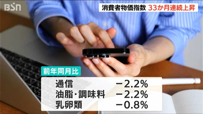 一方、携帯電話機などの通信費、油脂・調味料や卵、チーズなどは下落に転じました。