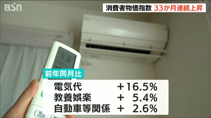 家庭で消費するモノやサービスの値動きをみる新潟市の7月の消費者物価指数は、食料品の値上がりに歯止めがかかったものの電気代が大幅にアップし、33か月連続で上昇しました。