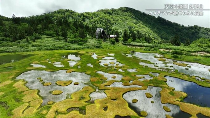 雪解け水をたたえるのは、池塘(ちとう)と呼ばれる大小さまざまな形の池。池塘のほとりに建つ三角屋根の建物は、高谷池ヒュッテです。皆さん外のベンチでひと休み。
