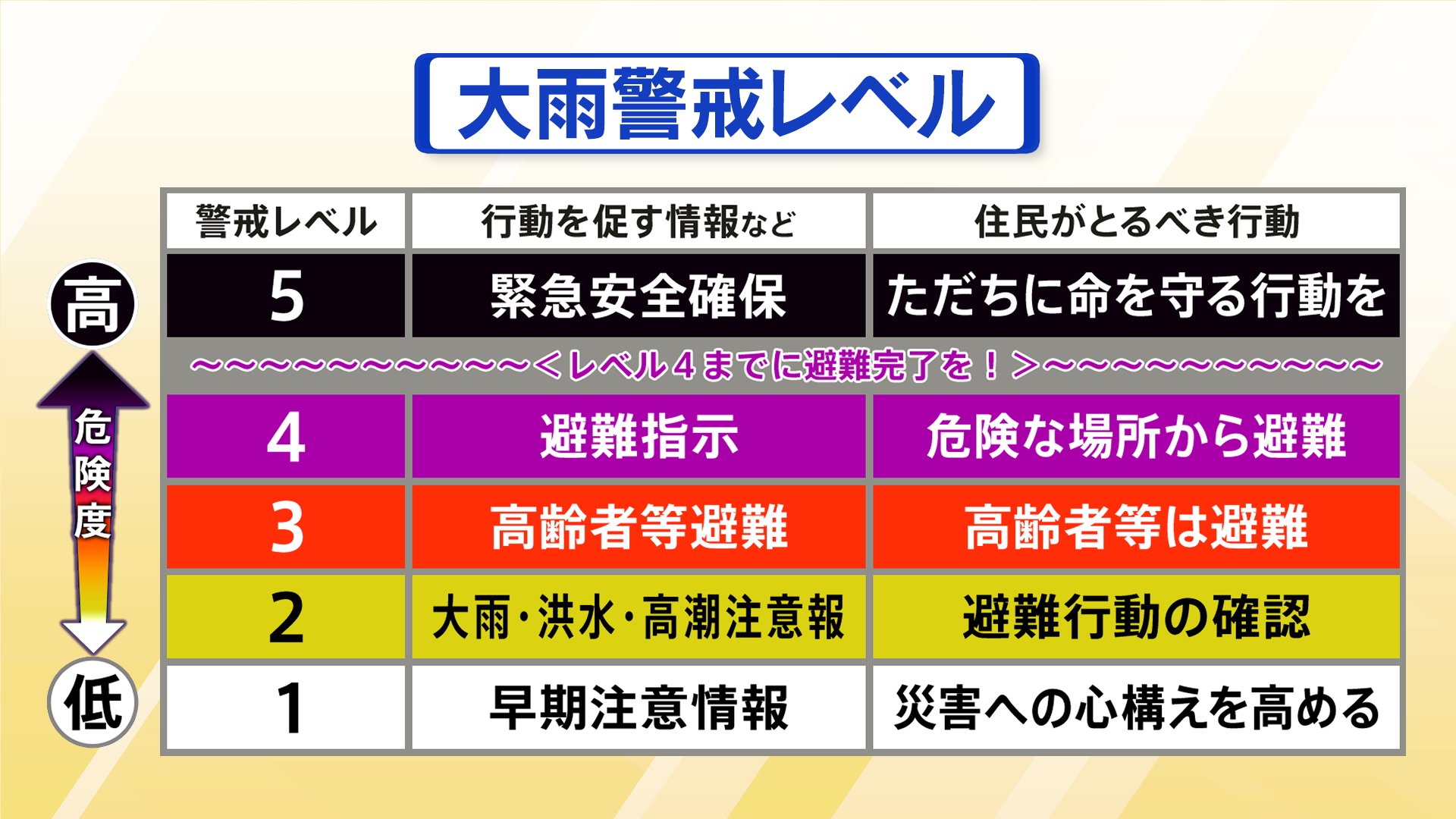 レベル4は、危険な場所にいる人は全員避難の対象になります。いつ災害が起きてもおかしくない状況です。レベル5になる前に避難を完了する必要があります。