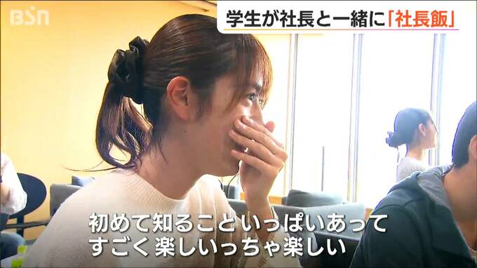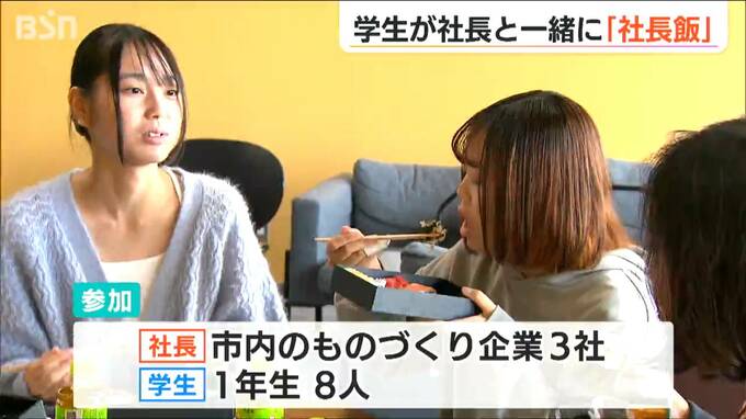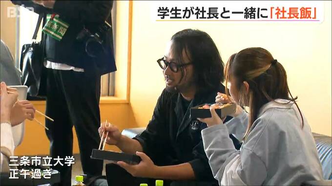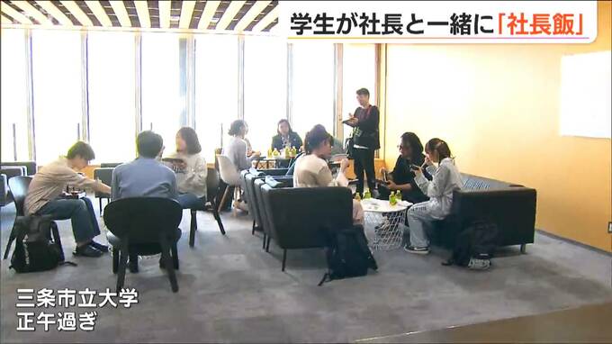 三条市立大学で開催されたのは学生と社長のランチ会。社長と昼ご飯を食べるので『社長飯』です。社長との交流で地域の魅力を感じてほしいと、三条工業会が企画しトライアル版が実施されました。
