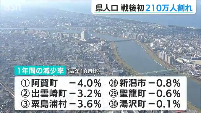 県が発表した10月1日現在の推計人口は209万8804人で、9月から1750人減り、戦後初めて210万人を割り込みました。