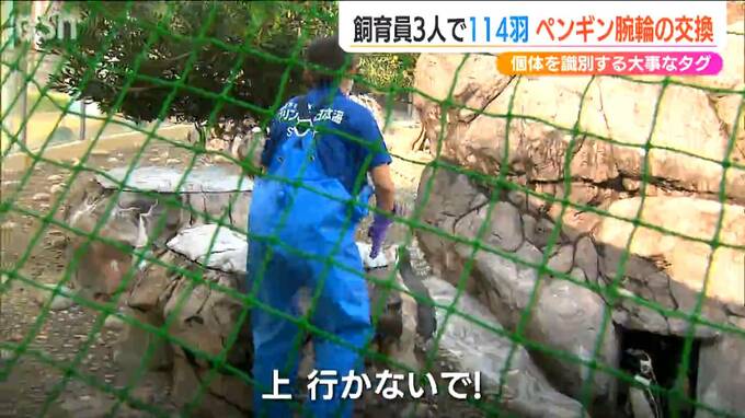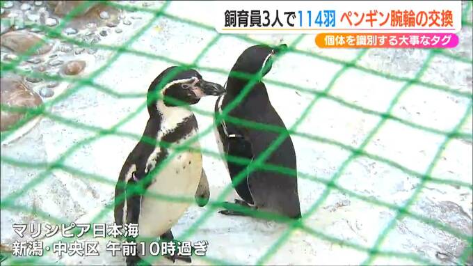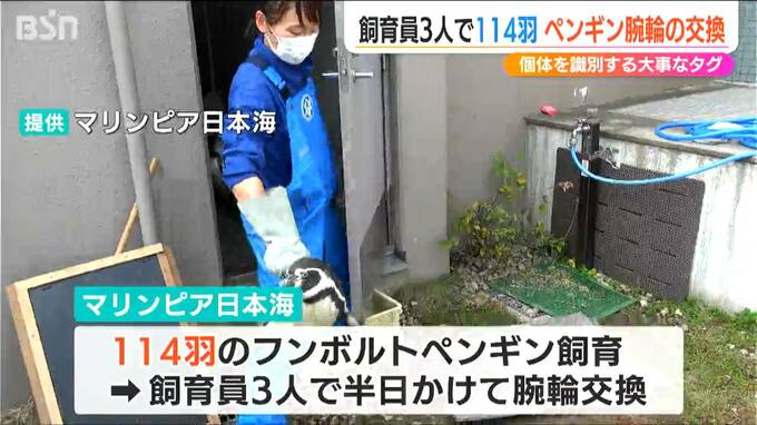 現在114羽のフンボルトペンギンを飼育しているマリンピア日本海では、飼育員3人が半日かけて、全てのペンギンの腕輪を交換していきます。