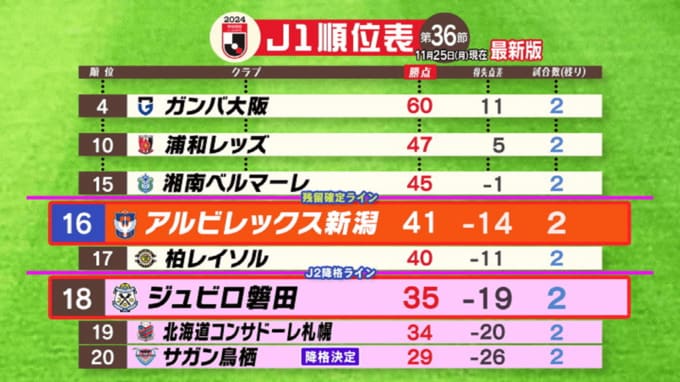 仮にジュビロ磐田が“2連勝”してアルビレックス新潟が“2連敗”した場合には、両チームの勝ち点が41で並ぶため、最後は得失点差での争いになります。