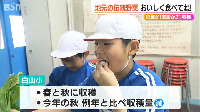 『寄居かぶ』は、この地域で300年以上前から栽培されてきましたが、街の都市化が進むにともなって、近年では生産者が減っています。そこで白山小学校では、地域の伝統野菜を守ろうと、8年前から『寄居かぶ』の栽培を行い、毎年、春と秋の2回収穫しています。