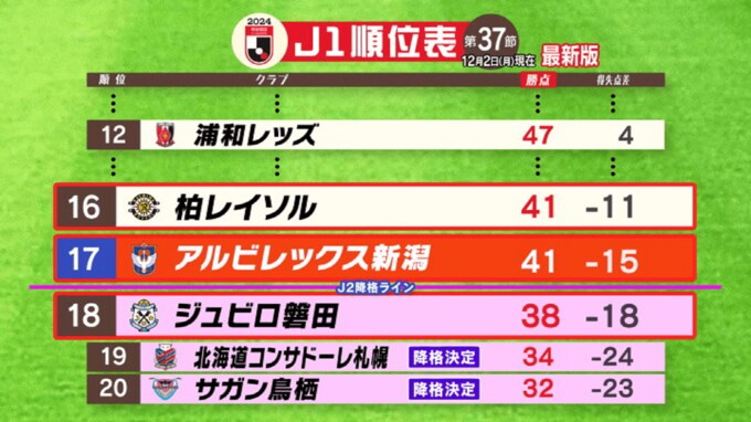 12月2日現在の順位表では、勝ち点を積み上げられなかったアルビに対し、柏レイソルは引き分けだっため、両者の順位が入れ替わりました。それぞれ勝ち点で並び、得失点差で柏が上回っています。