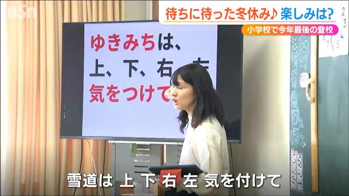 23日からの冬休みを前に、今年最後の登校となった子どもたちは、先生と一緒に冬休みの注意点を確認。雪道では車にいつも以上に気を付けることや、防犯上の注意ポイントなどを話し合いました。