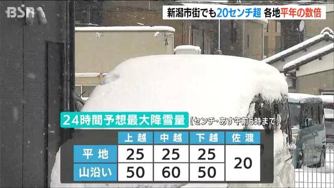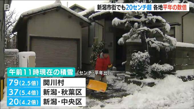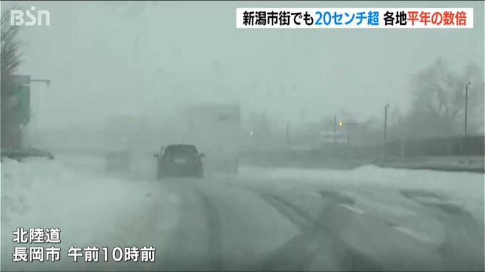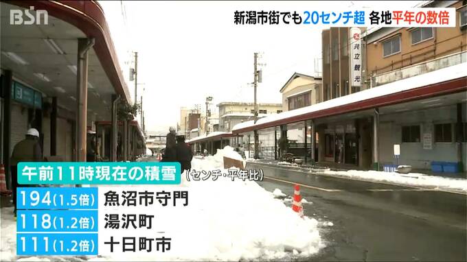 この冬一番の寒波により新潟県内は雪が降り続き、新潟市など平地でも平年の数倍の積雪となっています。