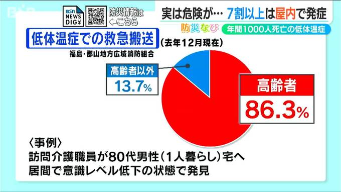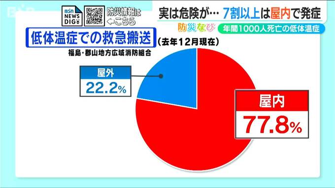 福島県の郡山地方広域消防組合の統計によりますと、低体温症で救急搬送された人のうち、77.8%が屋内での発症が推測される状況でした。
