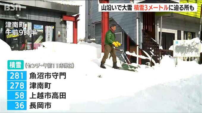 午前11時現在の積雪は魚沼市 守門で2メートル81センチ、津南町で2メートル78センチなどとなっています。