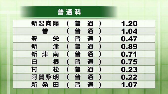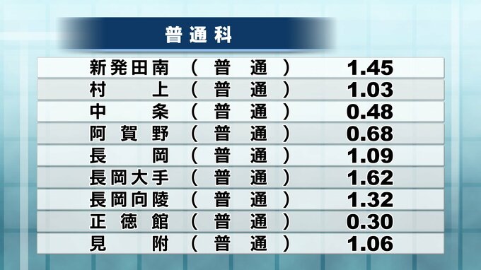 新潟県公立高校入試2025 志願倍率を発表 最高倍率は新潟・理数2.07倍 次いで市立万代・英語理数1.70倍 平均倍率は1.01倍【全校の倍率一覧】 2025年2月19日(水) 21:00 国内 暮らし・マネー 全日制 普通科 全日制の普通科は全体で1.06倍となり、1倍を超えています。 新潟高校で1.15倍、新潟南で1.27倍など。 また新津0.89倍、新発田1.07倍、長岡1.09倍、三条1.06、柏崎0.94、高田1.03などとなっています。