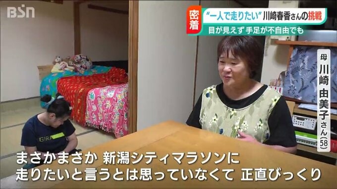 【母・由美子さん】「まさかまさか、新潟シティマラソンに走りたいと言うとは思っていなくて、正直びっくり。じゃあ私が車いすを押そうかと言ったら『ダメ!(歩行器で)自分の足で走ってみたい』と言われて…。頑固なんだよね、結構。こうと決めたら真っすぐだからね」