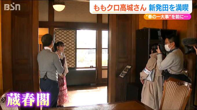 月岡温泉街の魅力を堪能した『ももいろクローバーZ』のメンバー・高城れにさんは、新発田市出身の実業家・大倉喜八郎の別邸「蔵春閣」を訪れて新発田市の歴史や文化も満喫していました。