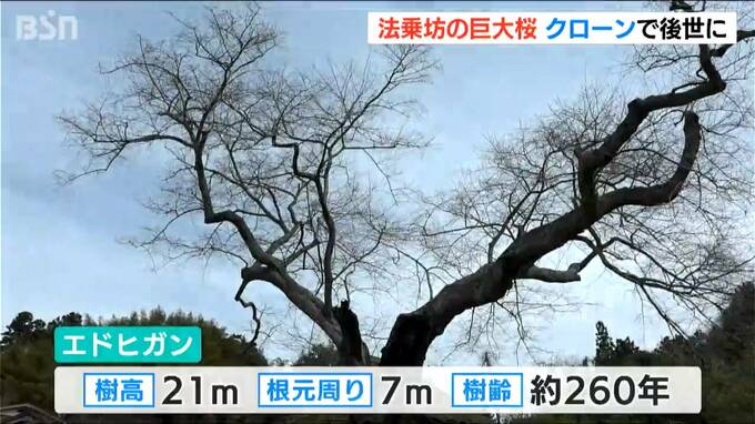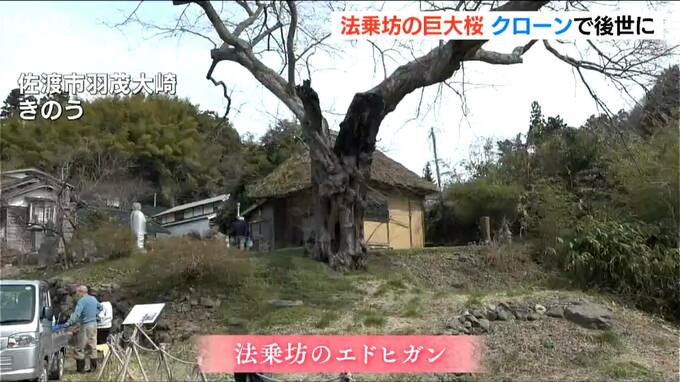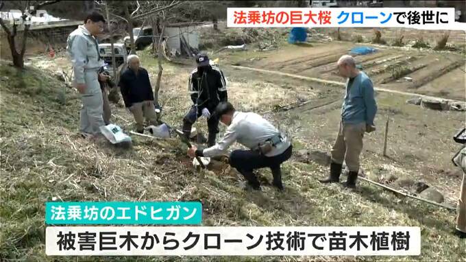新潟県佐渡市の天然記念物に指定され、大雪で被害を受けた巨大桜の脇に12日、クローン技術で育てられた新たな苗木が植えられました。