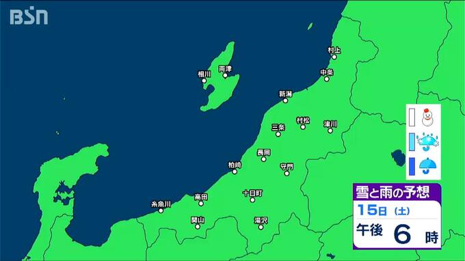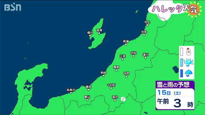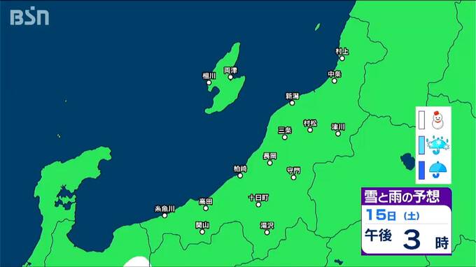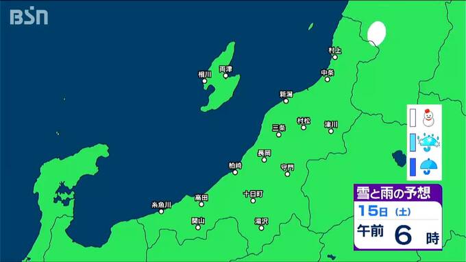 15日からは雪?いつ どこで降る?? 新潟県内は山沿い中心【3時間ごとの雪と雨の予想シミュレーション 17日迄】 2025年3月14日(金) 19:13 国内 天気 15日 3時間ごとの『雪と雨の予想シミュレーション図』