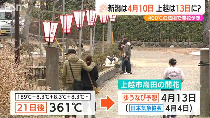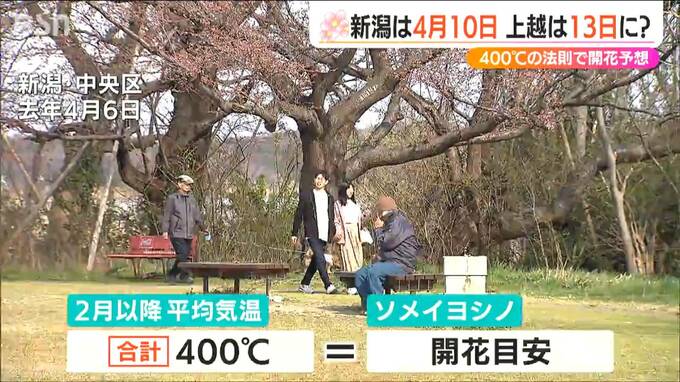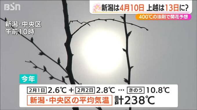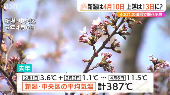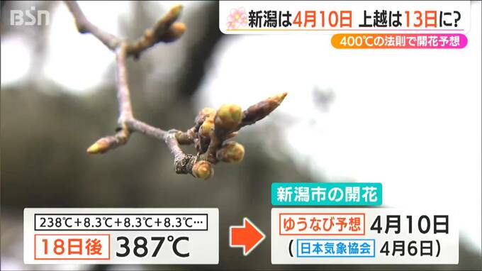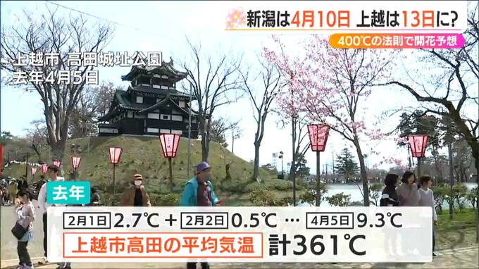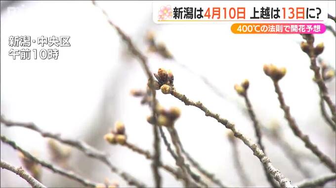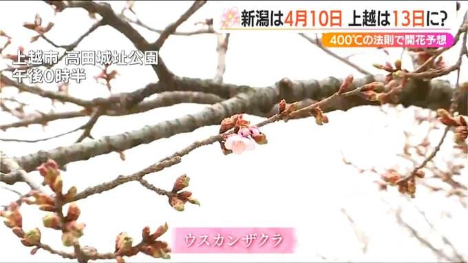 九州や四国、そして東京からもサクラの便りが届きました。サクラ開花400℃の法則ご存じでしょうか?これを元に新潟県内の開花日を予想したところ、新潟市は4月10日、高田公園は4月13日となりました。