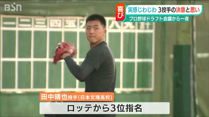 【日本文理高校 田中晴也投手】「まだ本当に自分がプロ野球の世界に入ったっていう強い実感まではきていないが、おめでとうと言ってくれる回数が増えるごとに『やっとプロ野球選手になれたんだな』と思います」