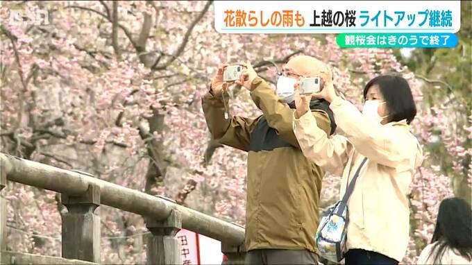 新潟県内の多くの地域で見ごろを迎えた桜。前日から続く花散らしの雨で14日は肌寒い一日となりました。ただ、まだ楽しめる桜もあり上越市の高田城址公園ではライトアップの継続を決めました。