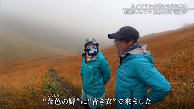 【登山者は】「草紅葉がとってもきれいもう少し天気が良ければ金色になりそう」「『金色の野』に『青き衣』で来ました」