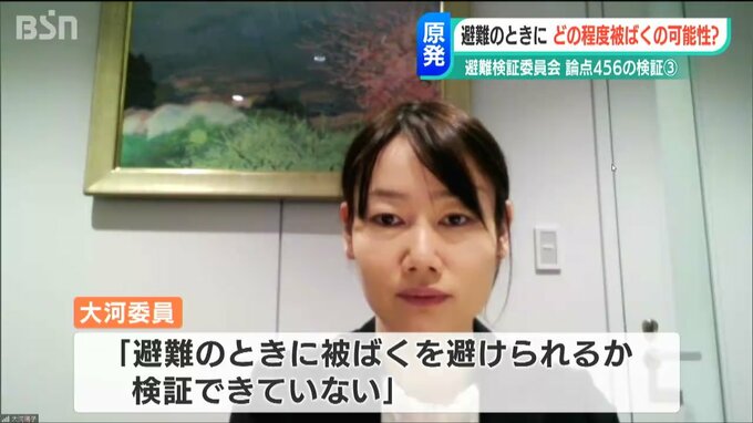大河委員は避難のときに被ばくを避けられるのか検証ができていないと課題を指摘します。今回の検証委員会では放射性物質がどのように拡散し、どの程度被ばくをする可能性があるのかというシミュレーションが行われていません。