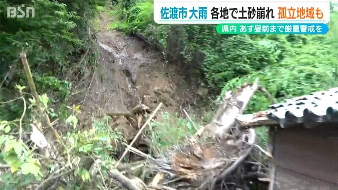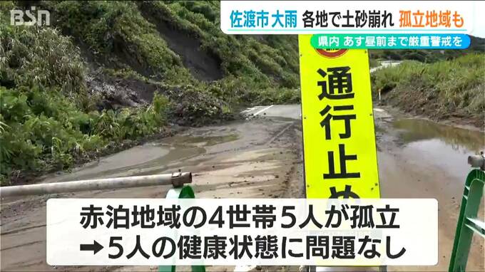 佐渡市によりますと、複数の土砂崩れや家屋の浸水被害があった他、土砂で道路がふさがった影響で赤泊地域の4世帯5人が孤立しているということです。