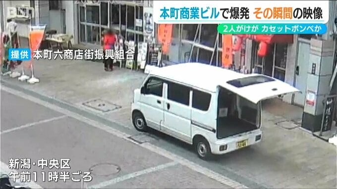 「新潟市 中央区 本町通りの商店街で爆発音がしたということで、あちらのショッピングセンターの戸が外れてガラスが割れているのが分かります」