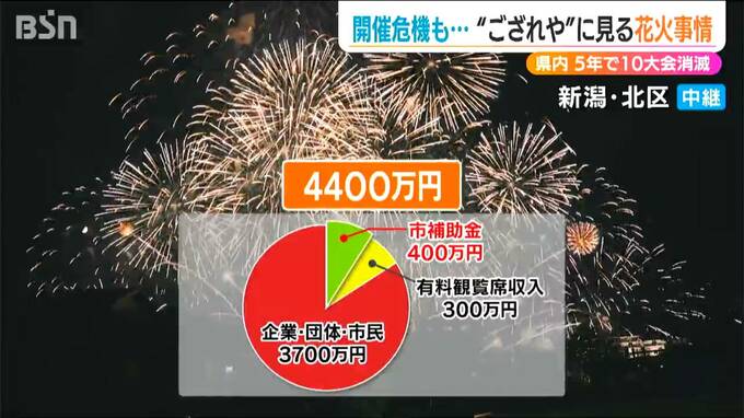 例えば新潟市北区の『阿賀野川ござれや花火』では、事業費はおよそ4400万円。