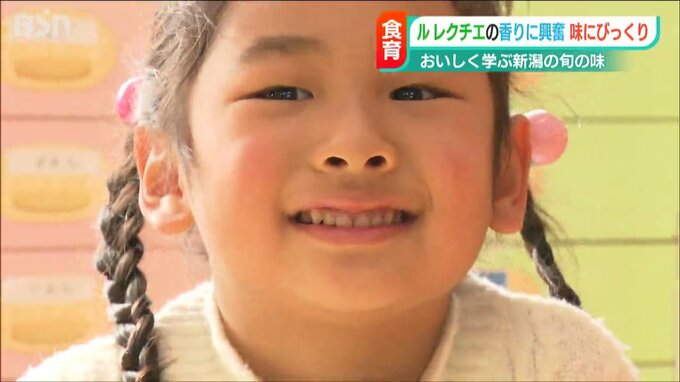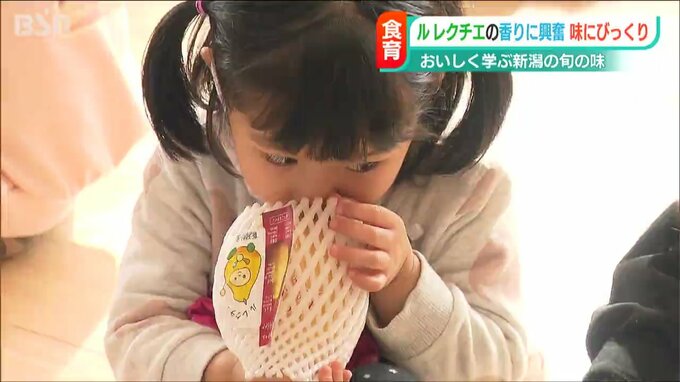 旬の食べ物のおいしさなどを知ってもらおうと、JA全農にいがたと新潟中央青果が企画したもので、園児30人がル レクチエについて勉強しました。