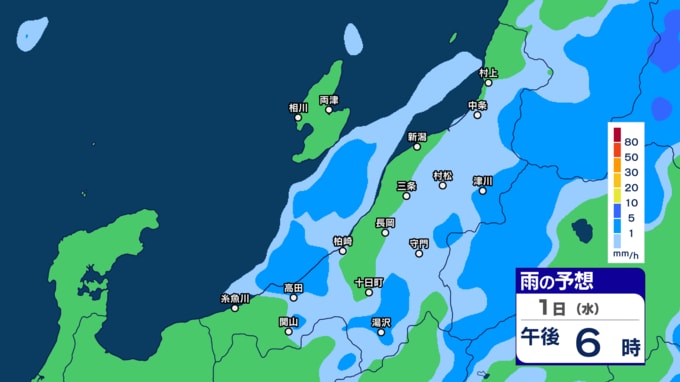【大雨情報】新潟県内はきょう1日は“バケツをひっくり返したような”激しい雷雨が降り大雨の所も 夜遅くにかけて土砂災害などに注意・警戒【1時間ごとの雨のシミュレーション・1日正午更新】 2025年10月1日(水) 12:03 国内 天気 1日午後6時~11時の雨シミュレーション