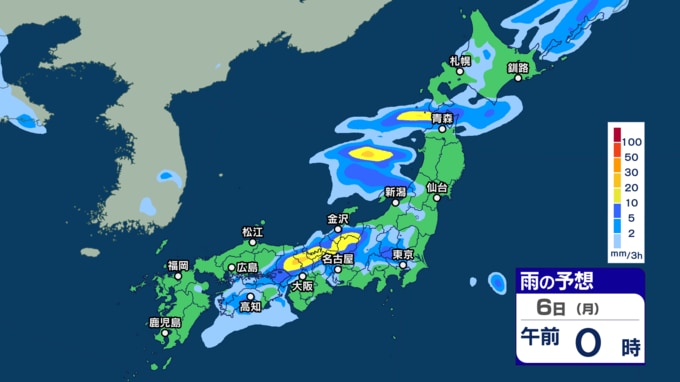 きょう2日は季節外れの“真夏日”の所も? あす3日以降は大気の状態が不安定で西日本などで雷を伴った激しい雨の恐れも【3時間ごとの雨シミュレーション・2日正午更新】 2025年10月2日(木) 12:00 国内 天気 6日(月)の雨シミュレーション
