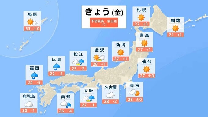 気象庁によりますと、きょう3日は東日本や北日本は高気圧に覆われて晴れる所が多くなる一方、低気圧や前線が近づく九州や四国、中国では雨となり、降り方が強まる所がありそうです。