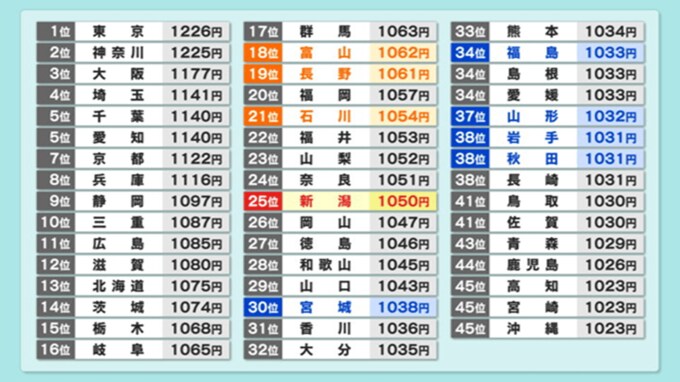 新潟県の近隣自治体では、富山県が1062円、長野県が1061円、石川県が1054円と新潟より高くなっていますが、東北各県は低く、宮城県は1038円、福島県は1033円です。