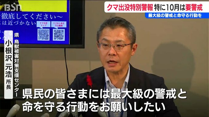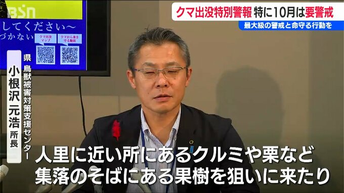 【県鳥獣害対策支援センター 小根沢元浩 所長】「秋の行楽のピークとなる3連休を控え、県民の皆様には最大級の警戒と命を守る行動をお願いしたい」