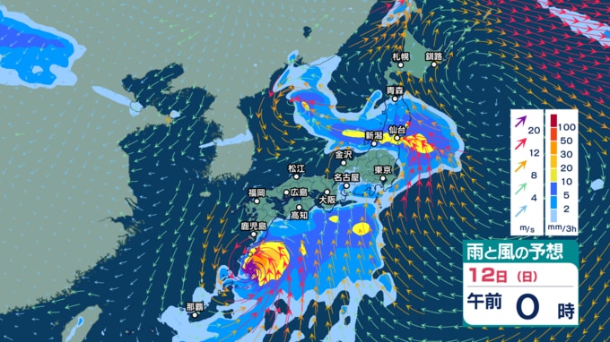 祝日13日(月曜日・スポーツの日)の『雨と風の予想図』