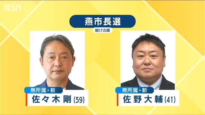 新人同士の一騎打ち 元会社員と元市議が立候補 新潟・燕市長選 2025年10月12日(日) 15:41 国内 現職の辞職に伴う燕市長選挙が12日に告示され、新人2人による16年ぶりの選挙戦が始まりました。燕市長選挙に立候補したのは届け出順に無所属で元会社員の佐々木剛さん(59)、無所属で元市議の佐野大輔さん(41)の新…