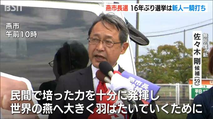 現職市長の辞職に伴う燕市長選挙が12日に告示され、新人2人による選挙戦が始まりました。