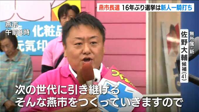 燕市長選挙に立候補したのは、届け出順に、無所属で元会社員の佐々木剛さん(59)と、無所属で元市議の佐野大輔さん(41)の新人2人です。