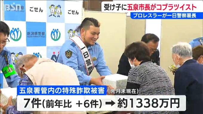 闘っているのはプロレスラーに五泉市の田辺正幸長、そして五泉警察署長。実は特殊詐欺防止イベントなのです。