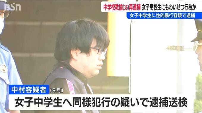 不同意性交などの疑いで再逮捕されたのは、新潟市立中学校教諭の中村岳容疑者(36)です。