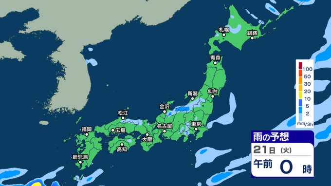 関東甲信~九州南部など太平洋側では20日にかけて雨の時間帯も 20日~21日にかけては日本海側でも雨に 北海道では雪?【3時間ごとの雨シミュレーション・19日正午更新】