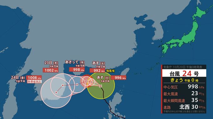 また、沖縄地方には、南シナ海を進む台風24号や高気圧周辺の暖かく湿った空気が流れ込んで、大気の状態が非常に不安定となり、21日にかけて雷を伴った激しい雨が降る所があるとしています。