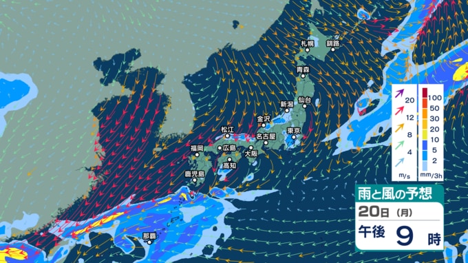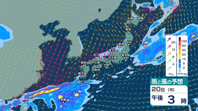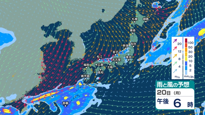 今後の雨と風のシミュレーションを見ると、きょう20日は沖縄や奄美では雨雲がかかり続ける見込みで、日本海側では雨に加えて北よりの風も強まる所がありそうです。夜は関東甲信などでも雨となるでしょう。