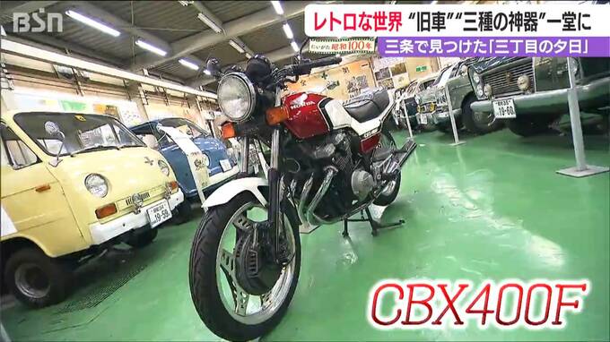 日産の第一号車・昭和13年式のダットサンに、今も人気が衰えないHONDAのCBX400Fなど懐かしい昭和の世界が広がります。