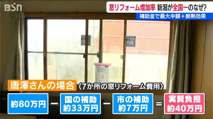 さきほどの唐澤さんの場合、7か所の窓をリフォームして、費用はおよそ80万円。ここに国の補助が33万円、新潟市の補助が7万円で、実質40万円の負担です。